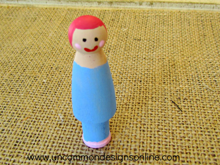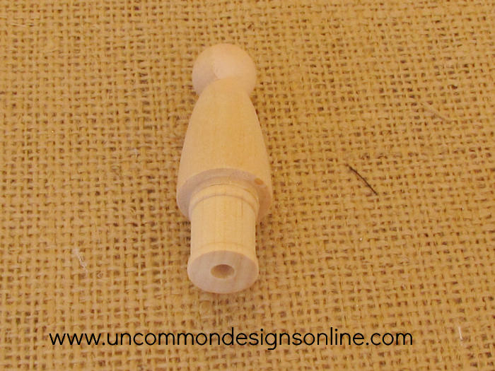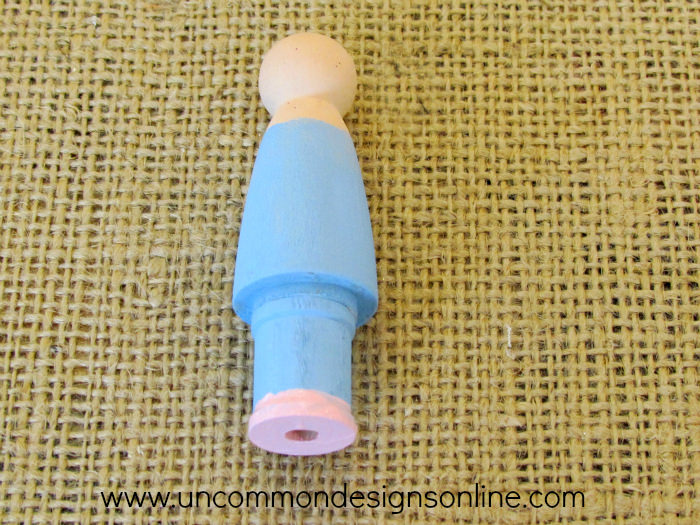 Step One. Glue the wooden spool to the bottom of the peg doll using the E6000 adhesive. Allow to dry.
