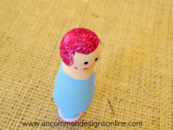 Step Four. Now it is time to add a little sparkle to our doll! I simply glittered where I had painted the hair with a beautiful strawberry pink fine glitter. Once it dried, I painted the entire peg doll with the triple thick sealer.
