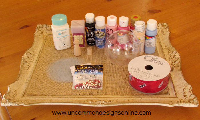 Supplies: plastic ornament, snow, wired ribbon, tulle circles, peg doll, red acrylic gems, wooden spool, assorted paints, glitter, E6000 adhesive