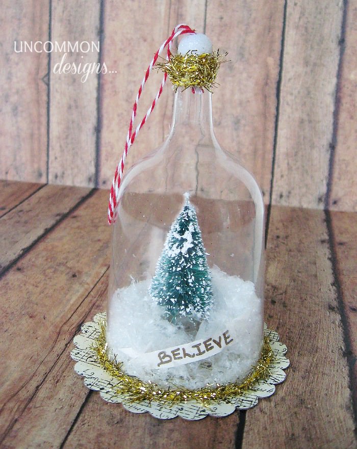 Take your baker’s twine and cut a length long enough to double over { about 6-7 inches }. I wrap tape around the ends of the twine to help thread it through the bead. Once you thread the twine through the bead, tie a knot in the end about 1 inch up. HINT: Make sure your knot is large enough not to pull back through bead! Place your little trinkets carefully on the base. Use your hot glue gun to apply glue to the bottom rim of the glass and press down the rim of the glass over the base with the tree, centering it on the scalloped paper base. Once it is dry, carefully add some faux snow through the opening in the top of the glass stem.