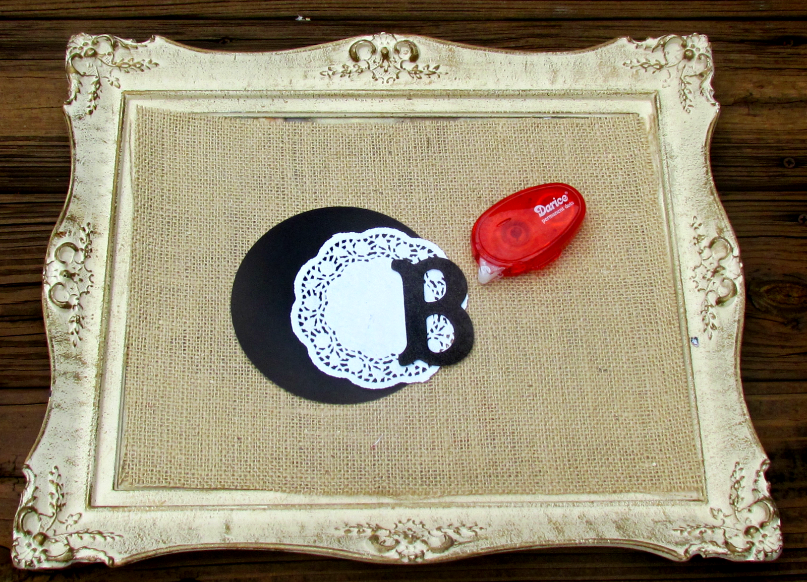Step Two.  Apply glue dots to the underside of the paper doily.  You will then flip it over and center onto the black circle.  Smooth to make sure it adheres well.  Now you will turn your letter over and apply the glue dots to the back.  Flip it back over and center on top of the doily and glue into place.