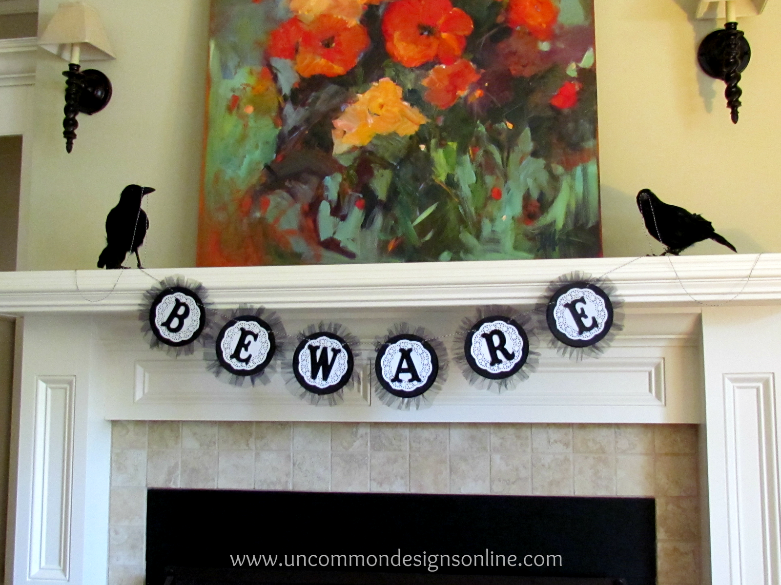 Halloween will be here before we know it and I just can’t wait! This year, I wanted something new to jazz up my holiday mantel, so I made a beautiful Beware Halloween Banner. I love that it is bold with black and white and the birds holding it up with their beaks just adds the perfect touch of whimsy!