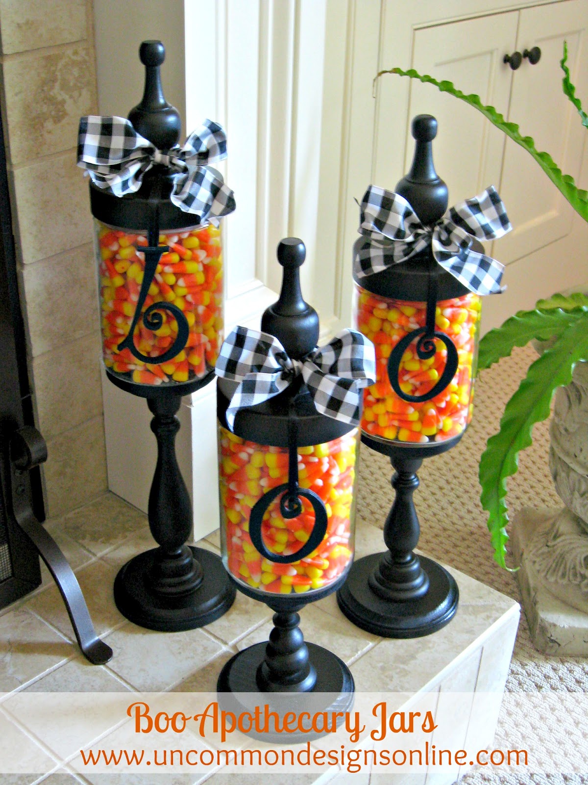 We made these jars ourselves with glass canisters from Hobby Lobby and unfinished wood candlesticks and parts. You can view this link… for more supply info.. https://uncommondesignsonline.com/2011/10/boo-and-joy-apothecary-jars-revisited.html
