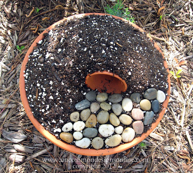 First, place a small amount of potting soil in the saucer. Then, place the small terra cotta pot on its side {a little offset to one side} in the saucer. This small pot will become the tomb of Jesus. Next, place more dirt in the saucer, and up and around the small terra cotta pot, making a small mound on each side.