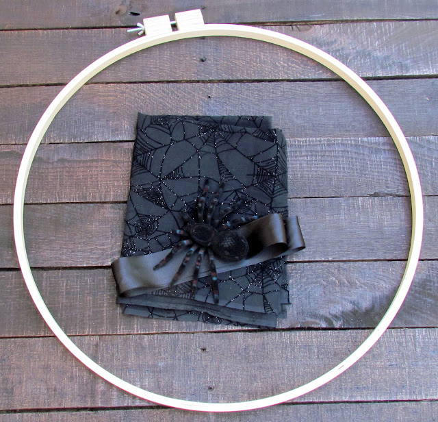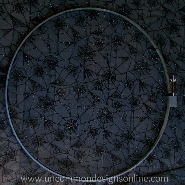 Spray paint your embroidery hoop black and let dry. Then, you will lay the fabric over the inner part of the embroidery hoop and place the larger hoop over and tighten.