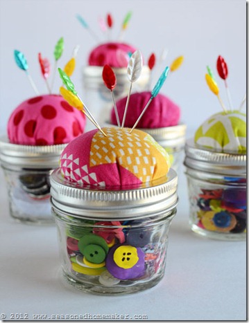 They are endless! I was looking for some inspiration for little La La’s 5th birthday party over the weekend and, as usual, I got totally sidetracked. I saw the pincushions below and totally got mason jars on the mind. If you would have asked me a decade ago what I thought about them, I would have thought they were a country craft for sure. Now, I love them! The fact that they are clear and have tops makes them just too perfect!