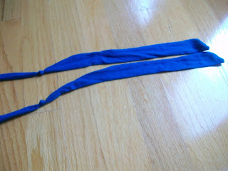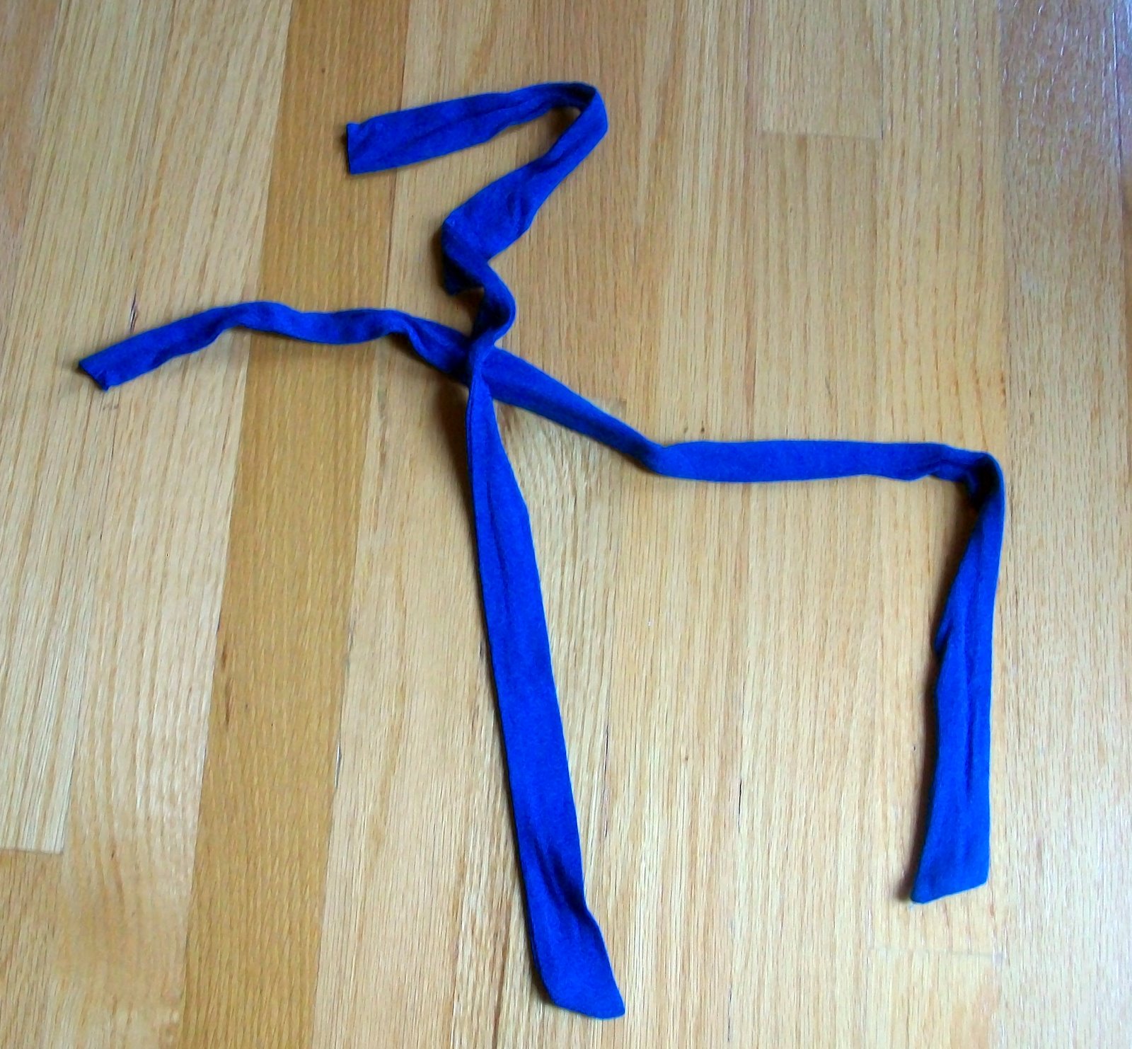 Make two casings about 1 1/2 inches wide and sew one end shut. I got lucky and could just snip the ties off of the shirt. Don’t you love it when that happens? Make it as long as you’d like, depending on how long you want your necklace to be. Keep in mind you are going to use a good bit in the knots so be liberal.
