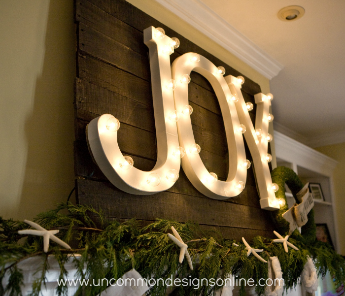 The song “Joy to the World” has always been special to me, I just love the air of celebration it brings to the holiday season. When I set out to create this mantel, I knew I wanted to include it somehow. I first thought of the lighted marquee letters for joy. Seriously, these letters are a blast, they are insanely large and bright and they are exactly what I had envisioned. You can find the complete tutorial of how to make the lighted marquee letters in our letters in light post.