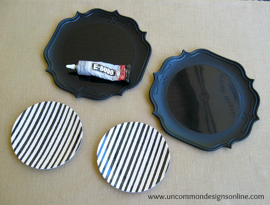 Clean the plates well with soap and warm water, thoroughly dry. Apply the e6000 glue to the back of the smaller plate and press down in the center of the larger plate. Allow it time to dry.