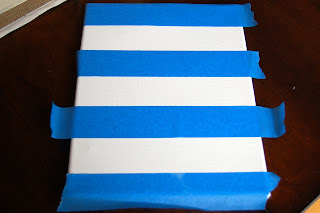 Start with a blank canvas. Using painters tape, I measured, then marked where I wanted my stripes to be. Then place your tape down, & paint in every other line. You will want to get the sides of the canvas as well, I had to go back & re-tape & paint them, since it looks a lot better that way.