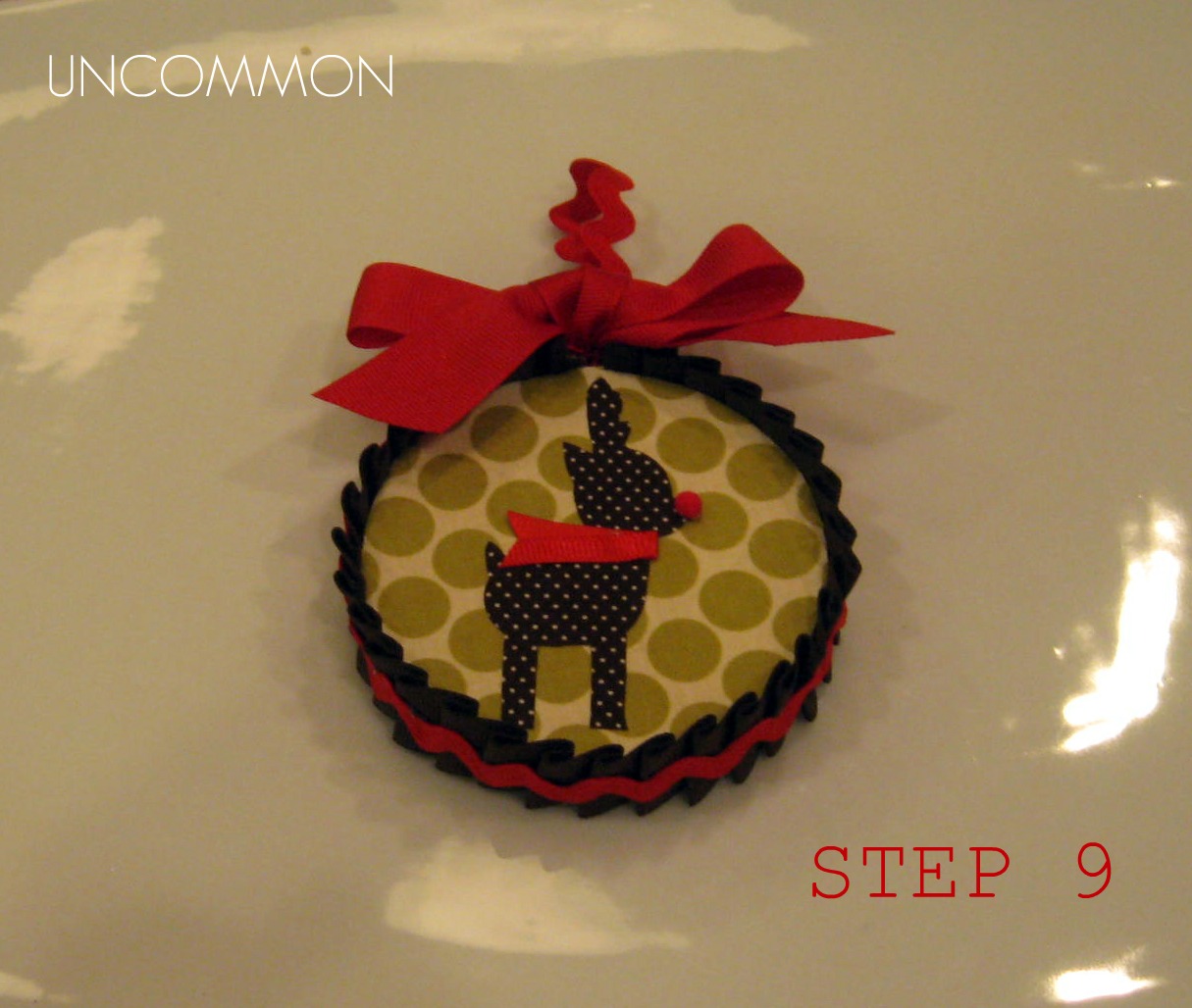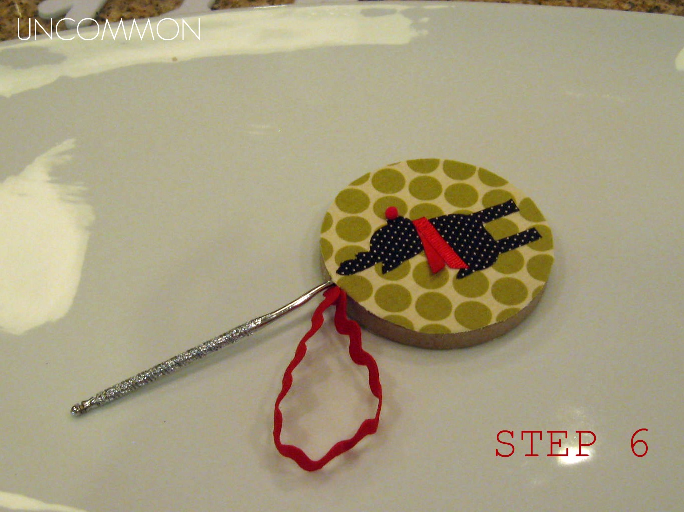 Cut a piece of red rick-rack and “push” the ends into the hole at the top of the ornament. Secure with a little glue from your glue gun!