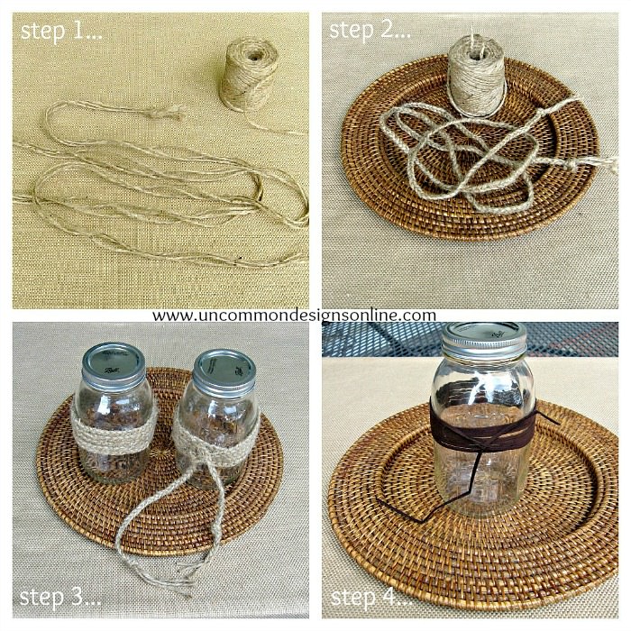 length around jar x number of times to wrap {5} x 2.5 = cut length of jute twine {you will need 3 cut lengths to braid together!}