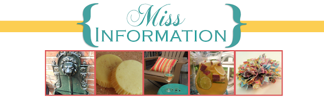 Miss Information is our newest sponsor! Kelley is the creative mind behind this adorable blog. As she says… ” Miss Information is a blog where food, fun, and friends come together.” At Miss Information, you can find crafts, cooking, decorating, and cleaning tips! Stop by and say “Hello!”
