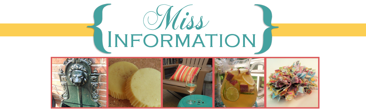 Miss Information is our newest sponsor! Kelley is the creative mind behind this adorable blog. As she says… ” Miss Information is a blog where food, fun, and friends come together.” At Miss Information, you can find crafts, cooking, decorating, and cleaning tips! Stop by and say “Hello!”