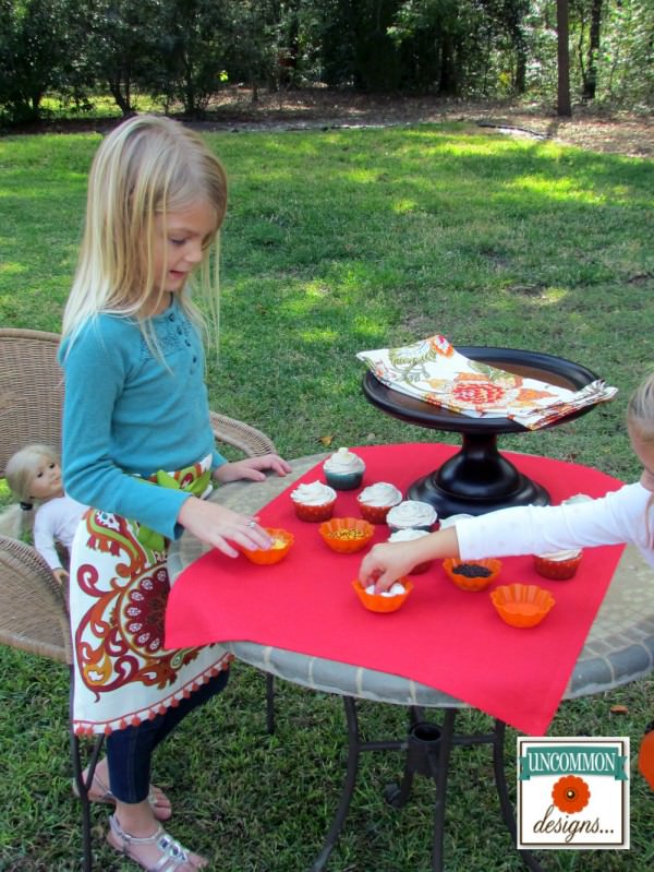 I decided to make the girls ultra-easy aprons and we would have an afternoon of baking cupcakes and packaging them up to show some of our favorite friends how thankful we are for them. I don’t know who was more excited… me or the girls?!