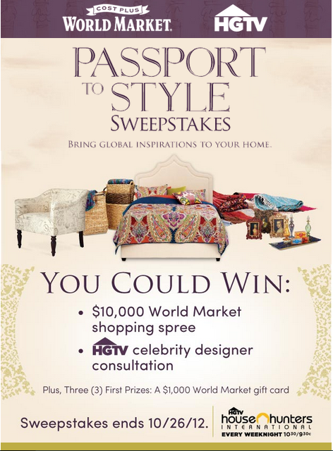 - Grand Prize package includes: A $10,000 World Market shopping spree and design consultation with an HGTV Designer