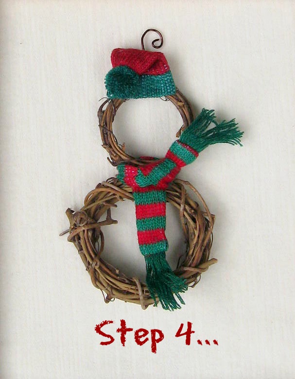 Finally, tie the little scarf around the middle of the snowman where the two wreaths meet. Fold the little hat over on itself and attach the pom pom to the bottom of the hat with your glue gun. Attach the hat to the top of the wreath with the glue gun and your little, simple snowman Christmas ornament is complete!