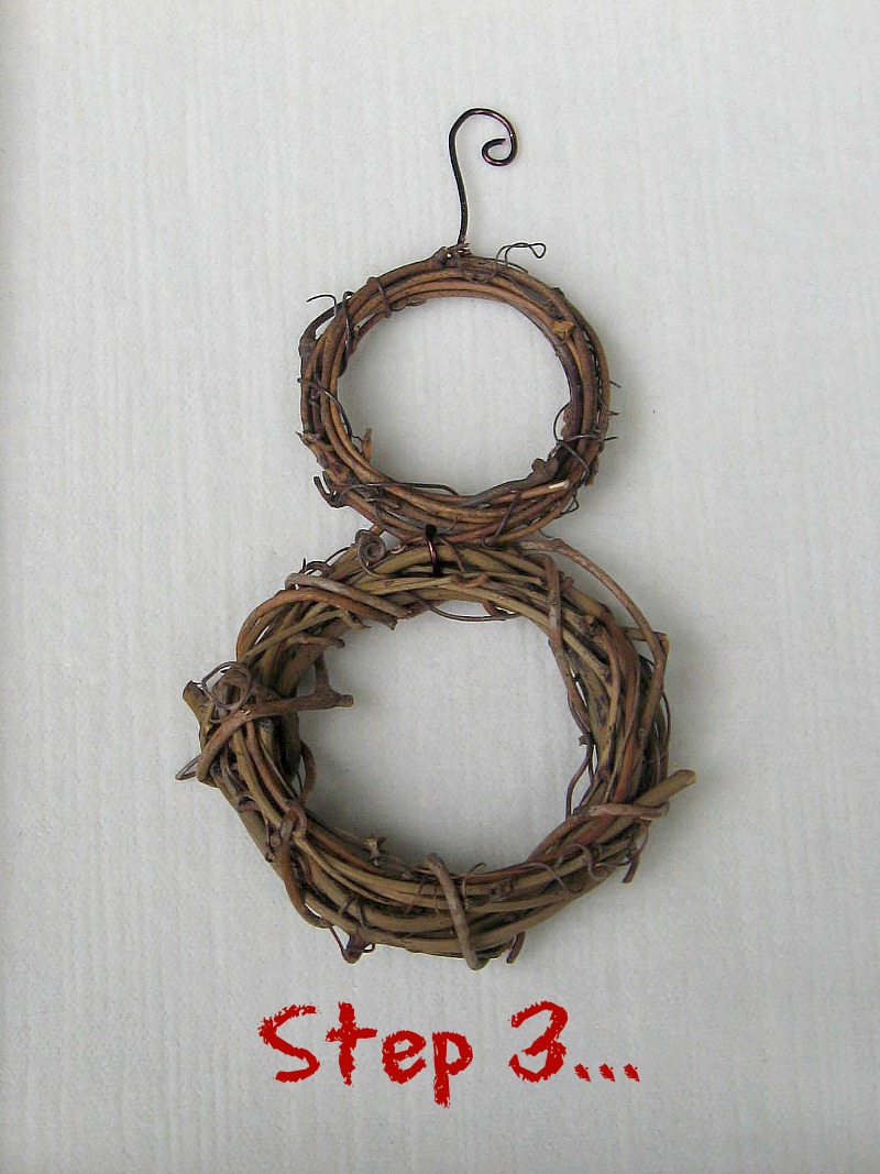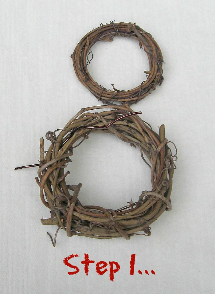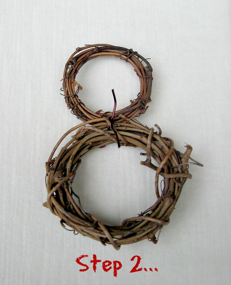 Start by cutting a small piece of copper craft wire and pushing it through the larger wreath and then through the smaller wreath.