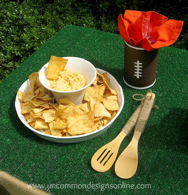 I also made these adorable Tin Can Footballs to hold all of the utensils for the tailgate…