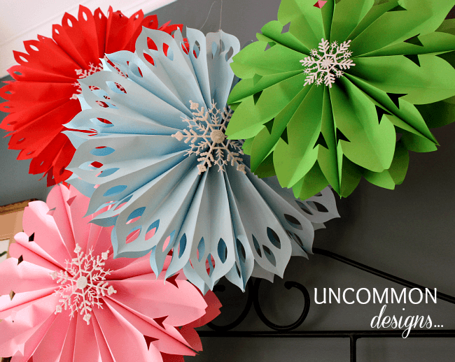 Next, I simply hot glued plastic white glittered snowflake to the middle of the paper flower. They were from Dollar Tree and came 10 to a pack. That’s it… crazy easy!