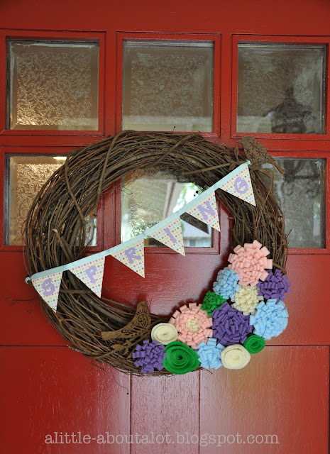 I love all of the beautiful felt flower embelishments on this spring wreath by A Little About A Lot