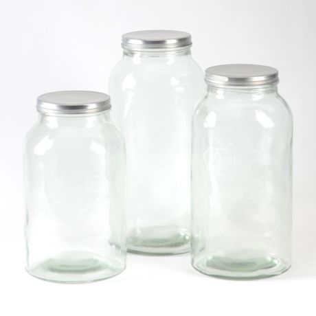 A fabulous set of Glass Mason Jars . Perfect for kitchen,pantry, or decor.